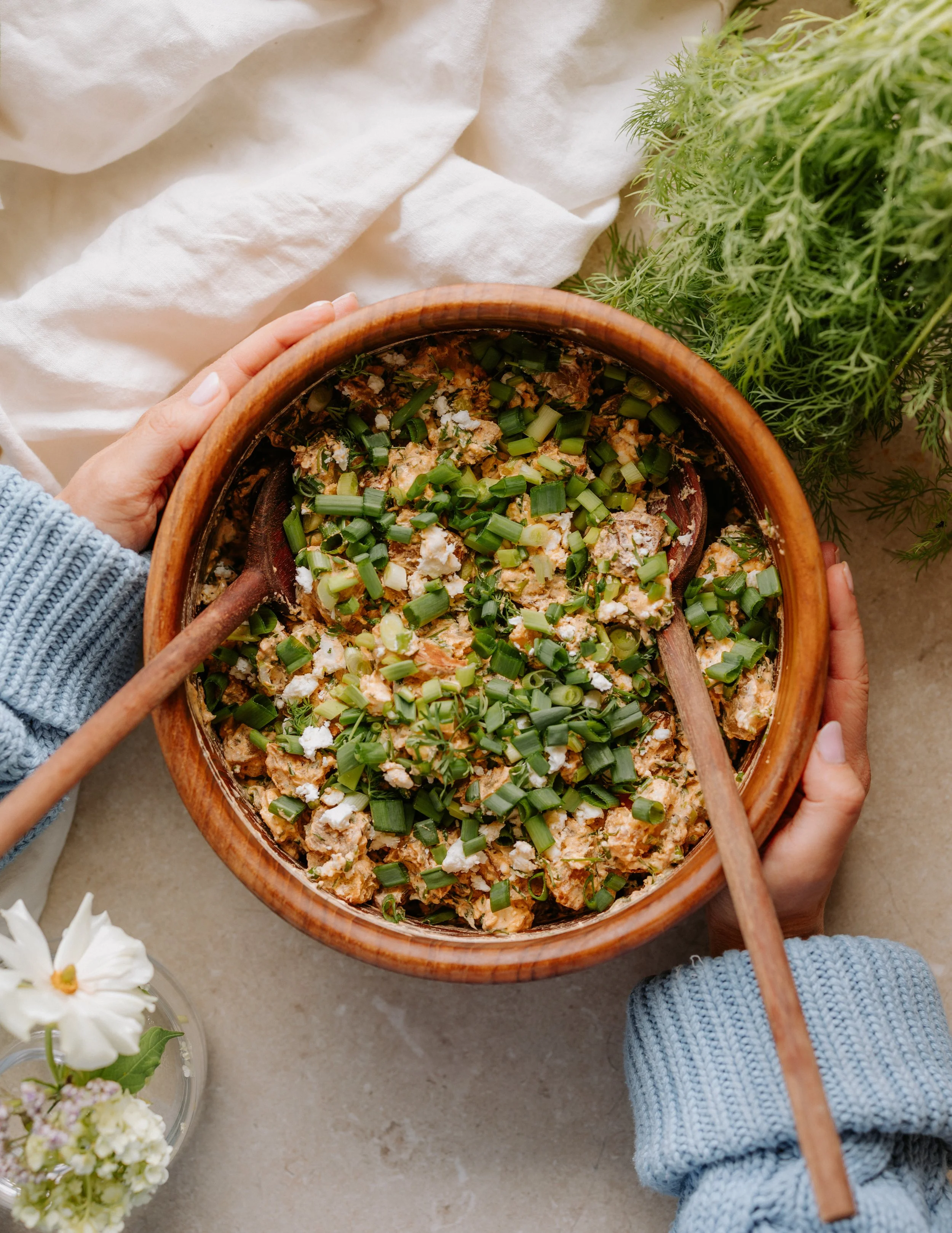 Koristele halutessasi kevätsipulilla ja fetamurulla tai vaikka orvokin kukilla.